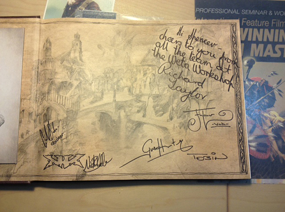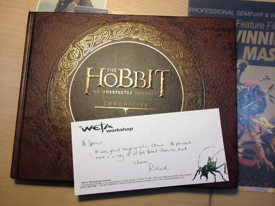 A personal message to Spencer by Sir Richard Taylor, Weta Workshop.“ Hi Spencer,It was great hanging out in China. As promised here is a copy of our first Hobbit Chronicles Book.